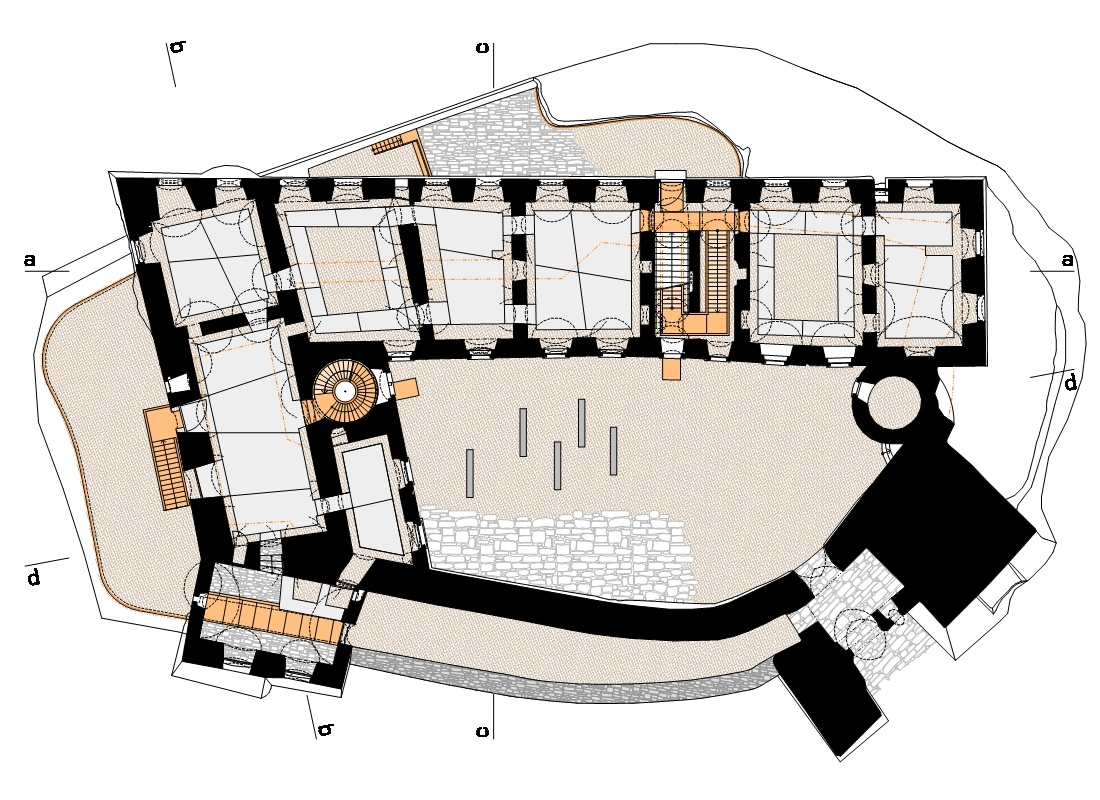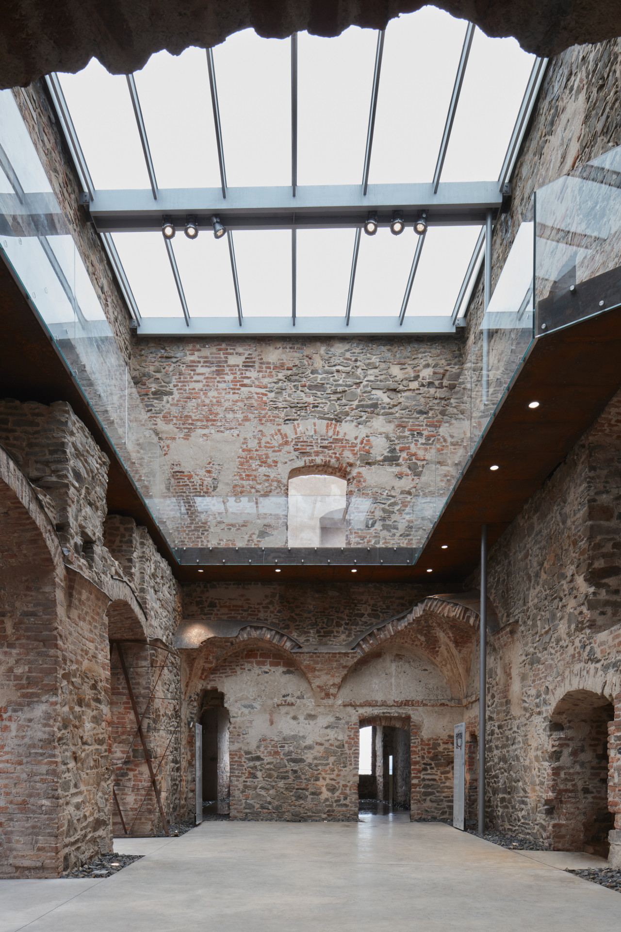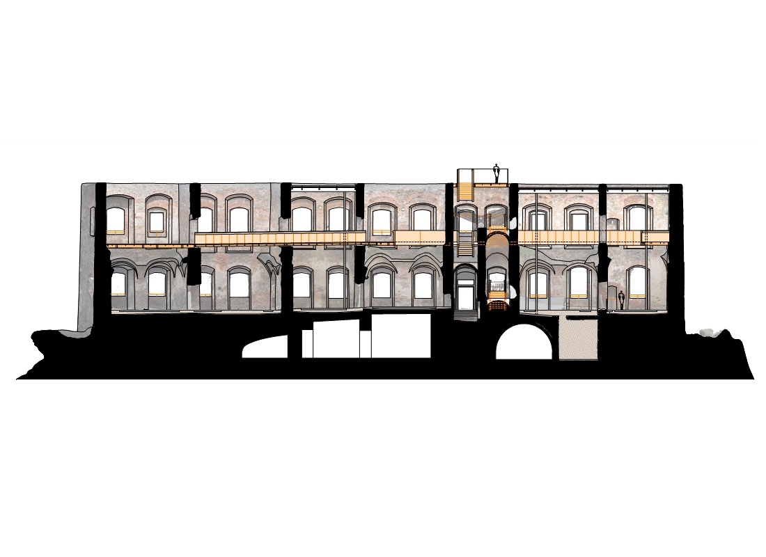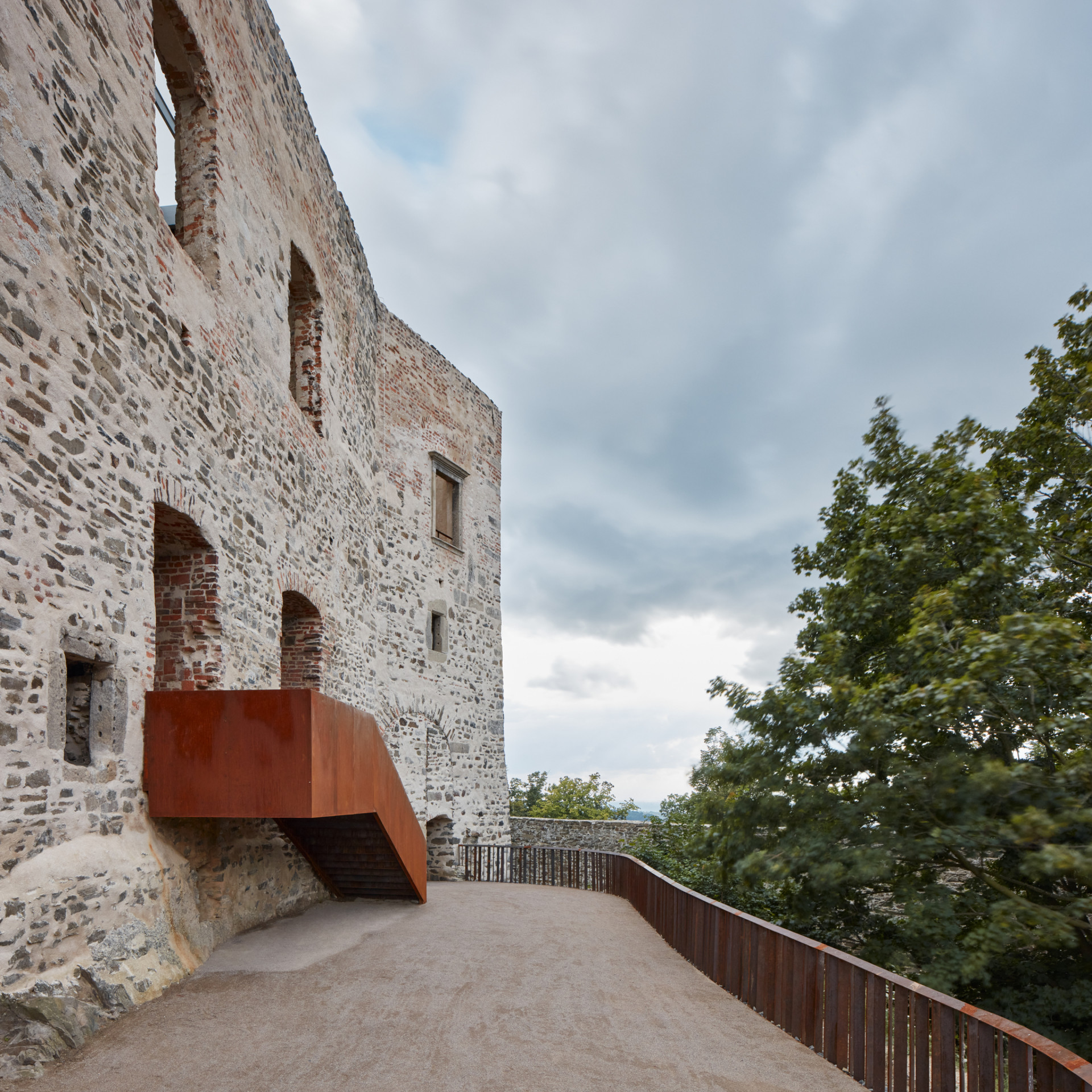 Our concept is based on the respect towards the historical building and it makes major effort to preserve the castle’s authentic character. We have chosen to work with glass on steel beams on the roof. Staircases and footbridges have been made of corten steel, a special iron alloy that undergoes a controlled corrosion, which gradually stabilizes. The rusty modern architecture elements compliment the character of the original structure. As a result, the castle palace acquired a new attractive sightseeing route that allows the visitors to learn about the palace. Additionally, the public can enjoy the sheer views from the previously collapsed ceilings, the walls and even from the roof level. They can discover the surroundings of the castle as well as understand and appreciate the modern architecture.