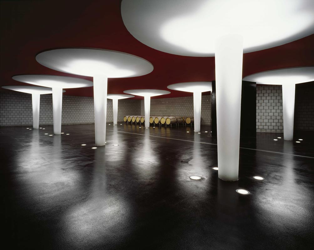 The masonry of the vineyard’s façade looks like an enormous basket filled with grapes. At closer view – in contrast to its pictorial effect at a distance – the sensual, textile softness of the walls dissolves into the materiality of the stonework. The observer is surprised that the soft, round forms are actually composed of individual, hard bricks. The façade appears as a solidified dynamic form, in whose three-dimensional depth the viewer’s eye is invited to wander. In the interior, the daylight that penetrates creates a mild, yet luminous atmosphere. Looking towards the light, the design becomes manifest in its modulation through the open gaps. It is superimposed on the image of the landscape that glimmers through at different levels of definition according to the perceived contrast.
