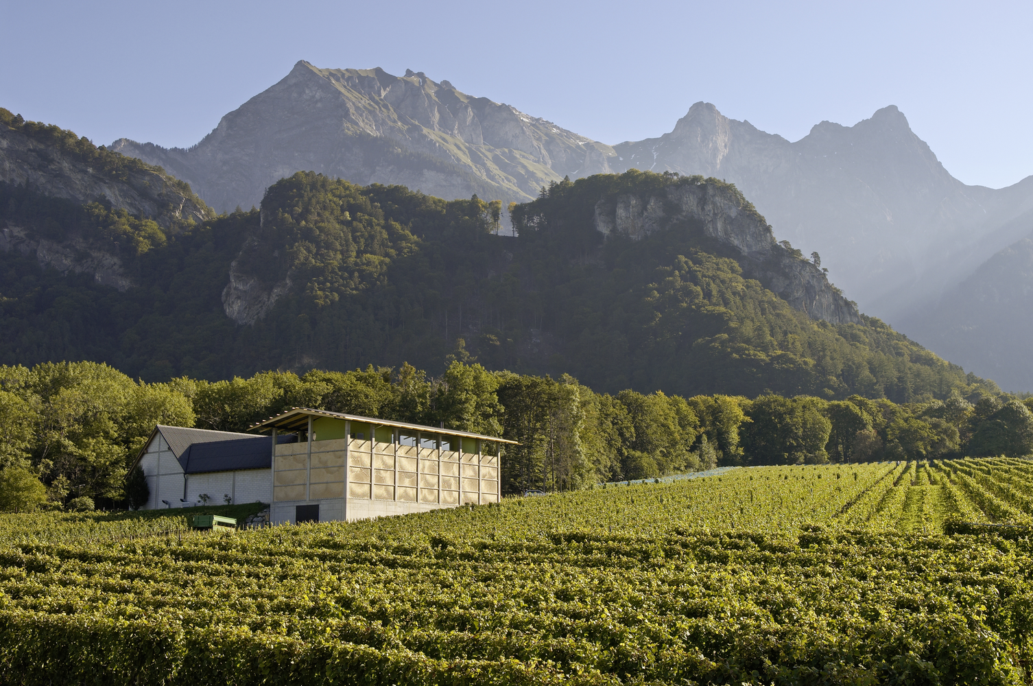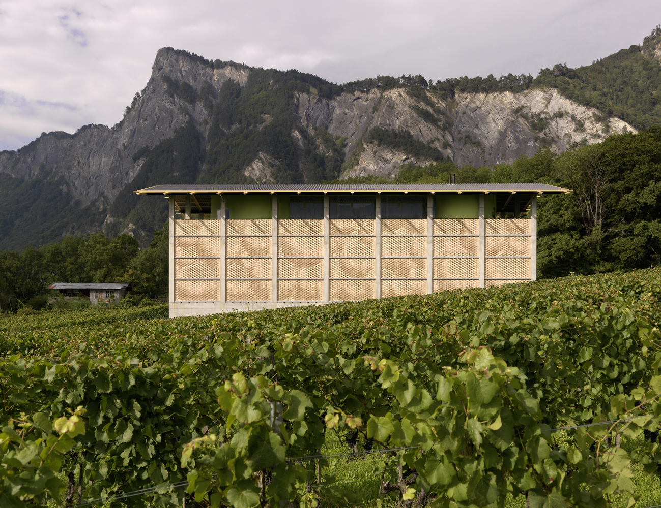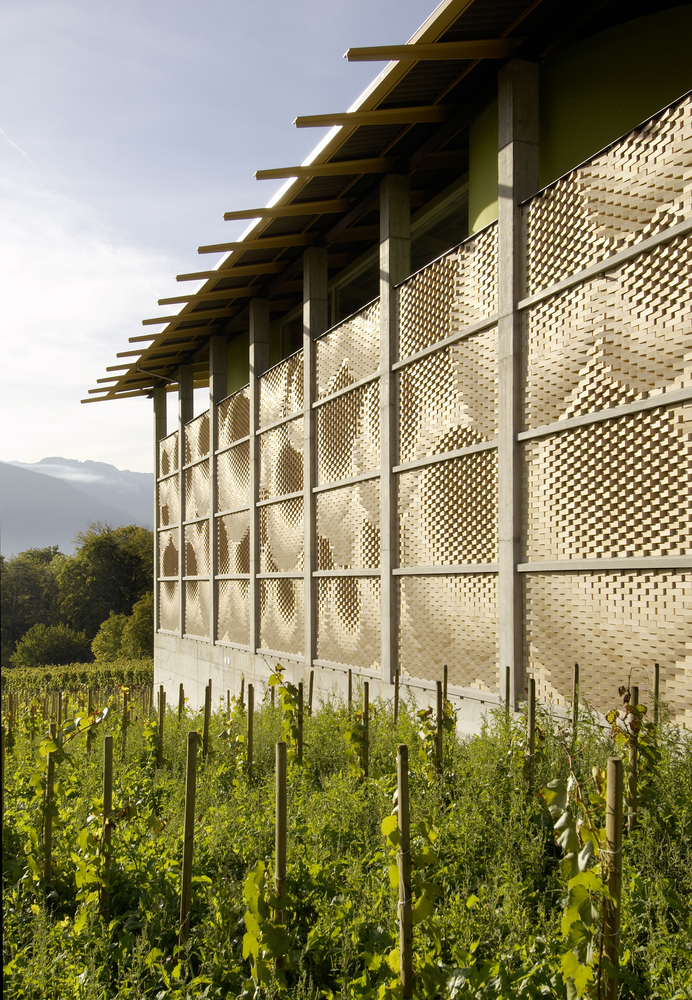 The project was realised as an extension of a small but remarkably successful vineyard. The wine producers wanted a new service building, consisting of a large fermentation room for processing grapes, a cellar dug into the ground for storing the wine barrels, and a roof terrace for wine tastings and receptions. Bearth & Deplazes Architects designed the project, and it was already under construction when they invited us to design its façade.