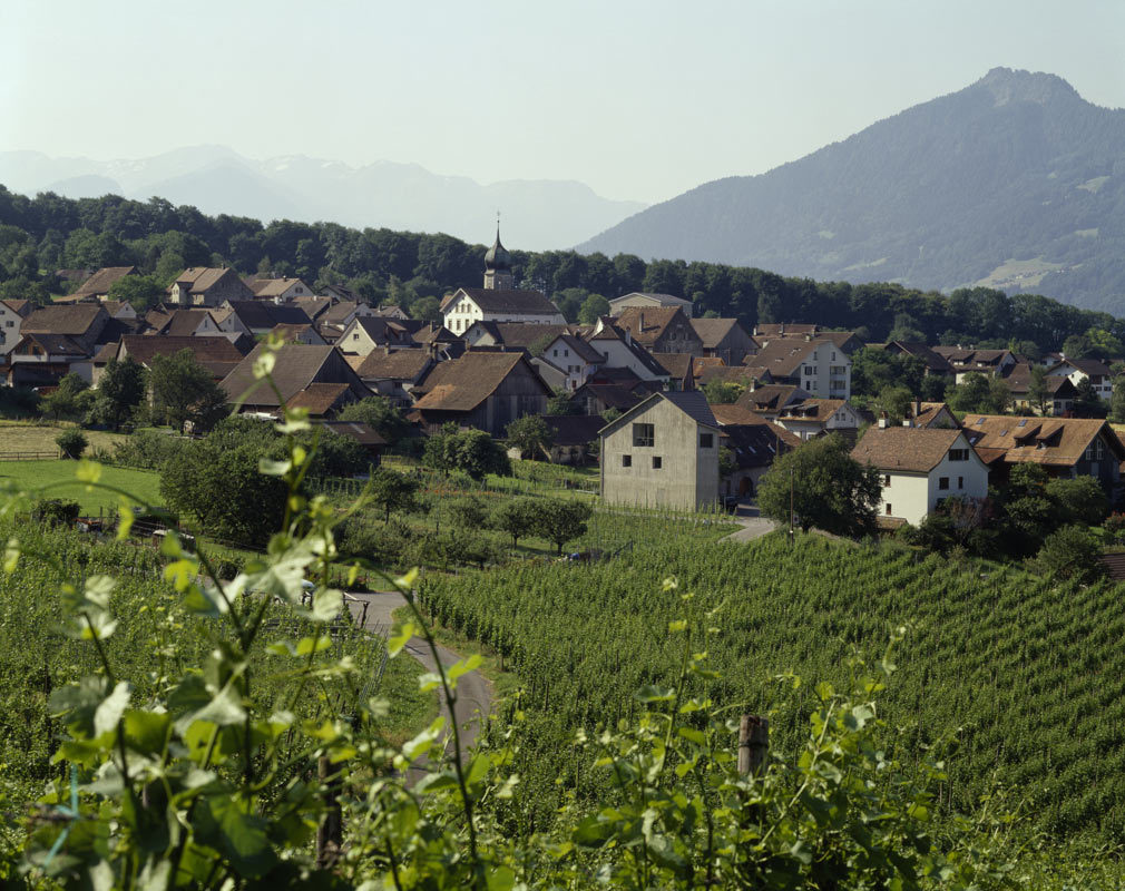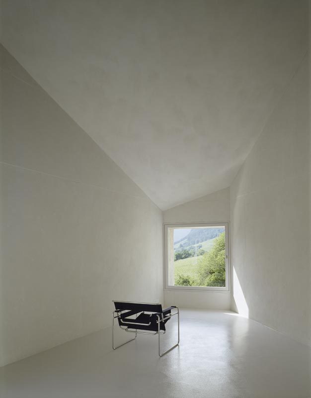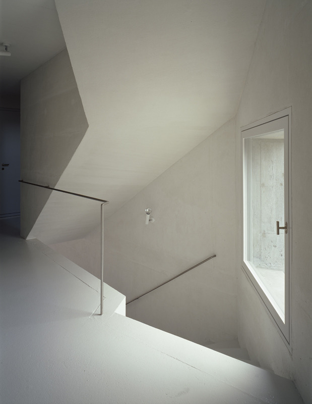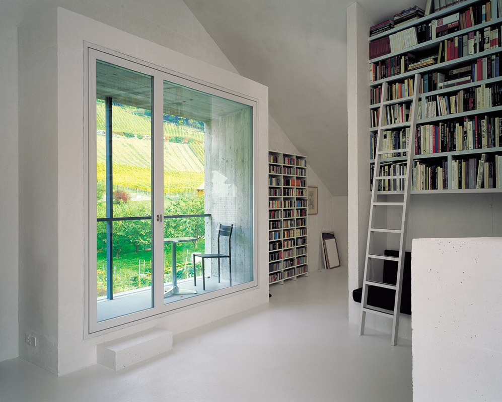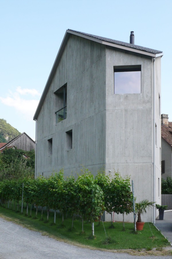 This tower-like house in fair-faced concrete stands guard over the edge of the village, bordering a lane leading to the vineyards beyond. Compact and sculptural like the old town houses in Fläsch, it owes is five-sided figure to the angular plot that led to a corset-like outline for the house, with a small garden on the south side. The living areas are divided on three floors: a garden level with kitchen/diner and guest room, above that the bedrooms, and at the top, the main living room with studio. All walls are of in-situ concrete, finished inside with a coat of grey-white plaster skim applied thinly so as to retain most of the roughness and the joint marks left by the formwork. This type of treatment only became feasible thanks to the invention of insulation-grade structural concrete. The 50 cm thick, single-skin, monolithic outer walls of the “tower-house“ have windows fitted flush on the inside. Although the house was built using technology quite different to that traditionally employed in the village, it nevertheless contributes more to the mature structure of this settlement and to the identity of Fläsch that any stylistic plagiarism. A Semper-like metamorphosis is perhaps detectable in the way the traces of the wooden formwork have been retained, thereby integrating the monolith more with the nearby farm buildings.