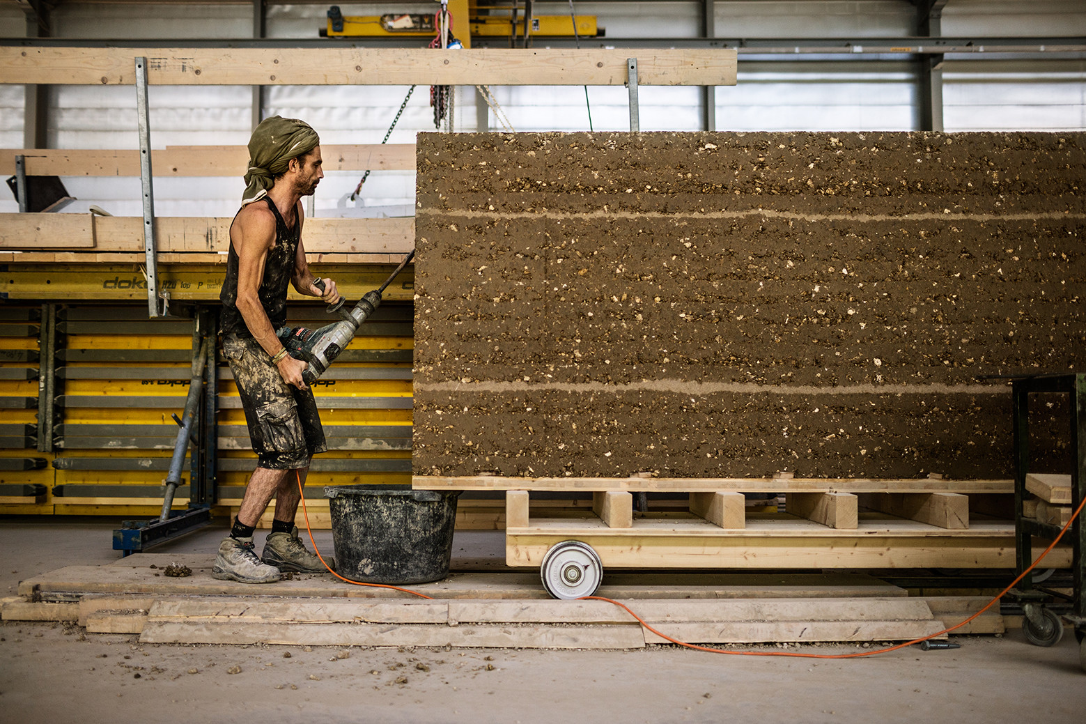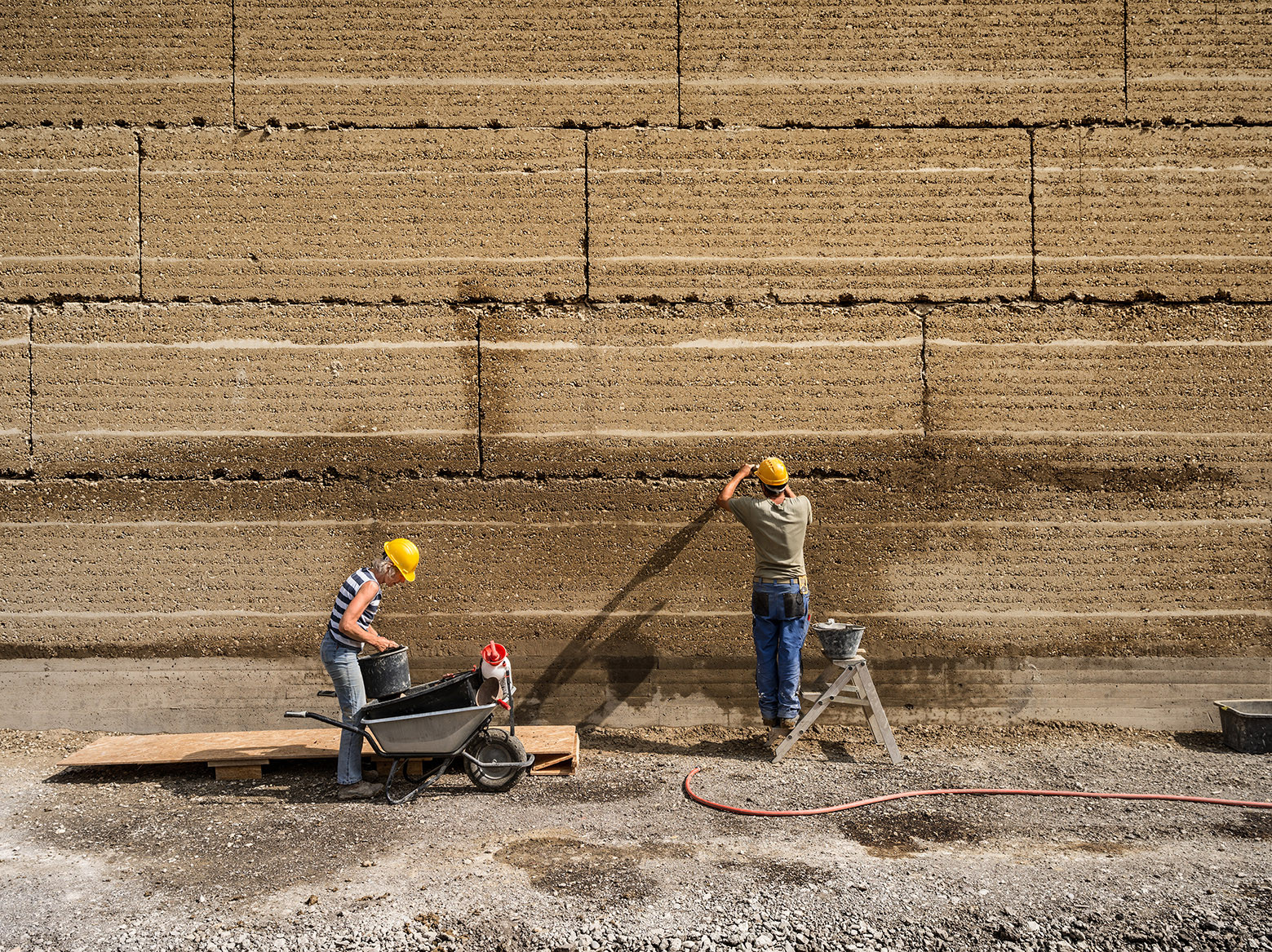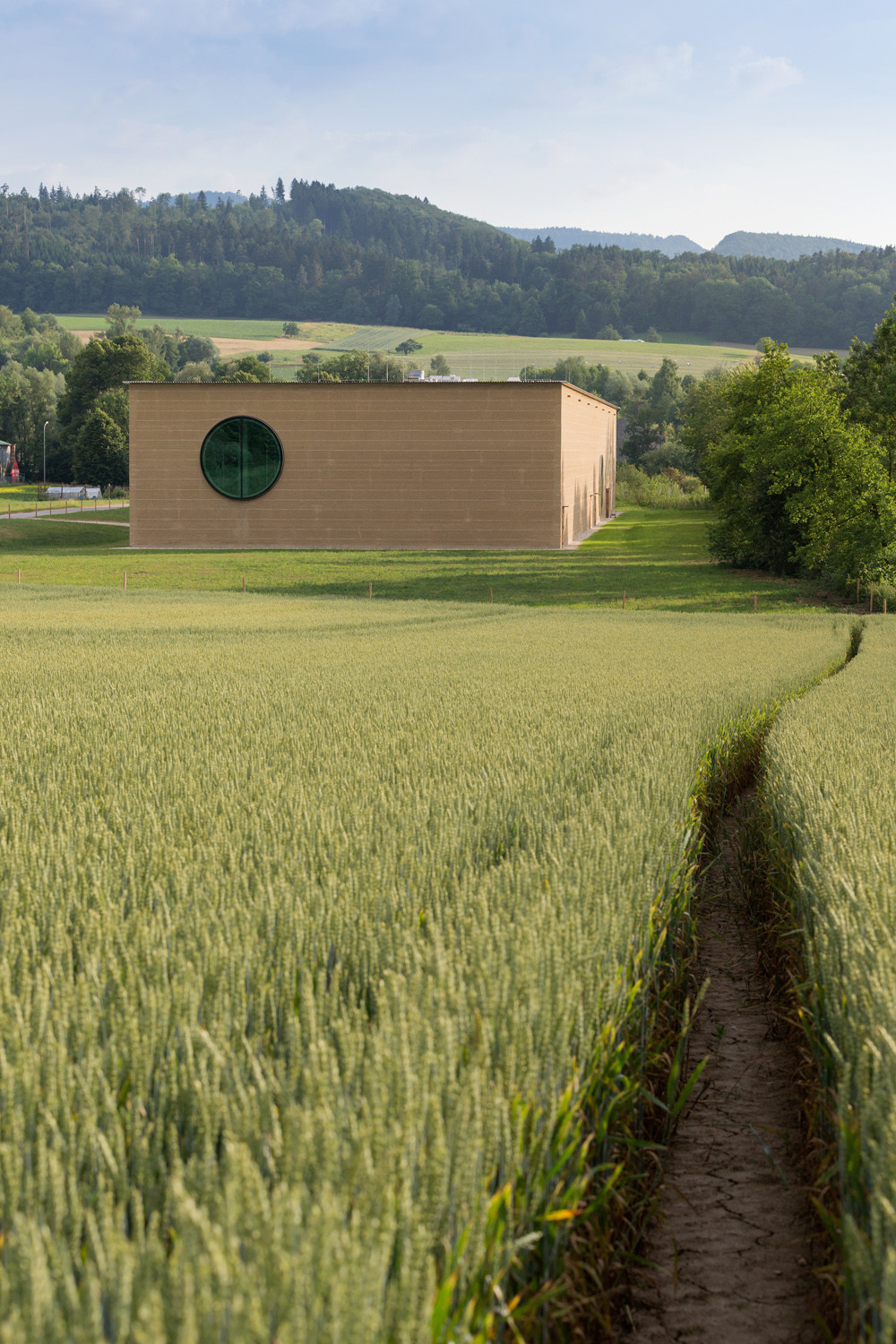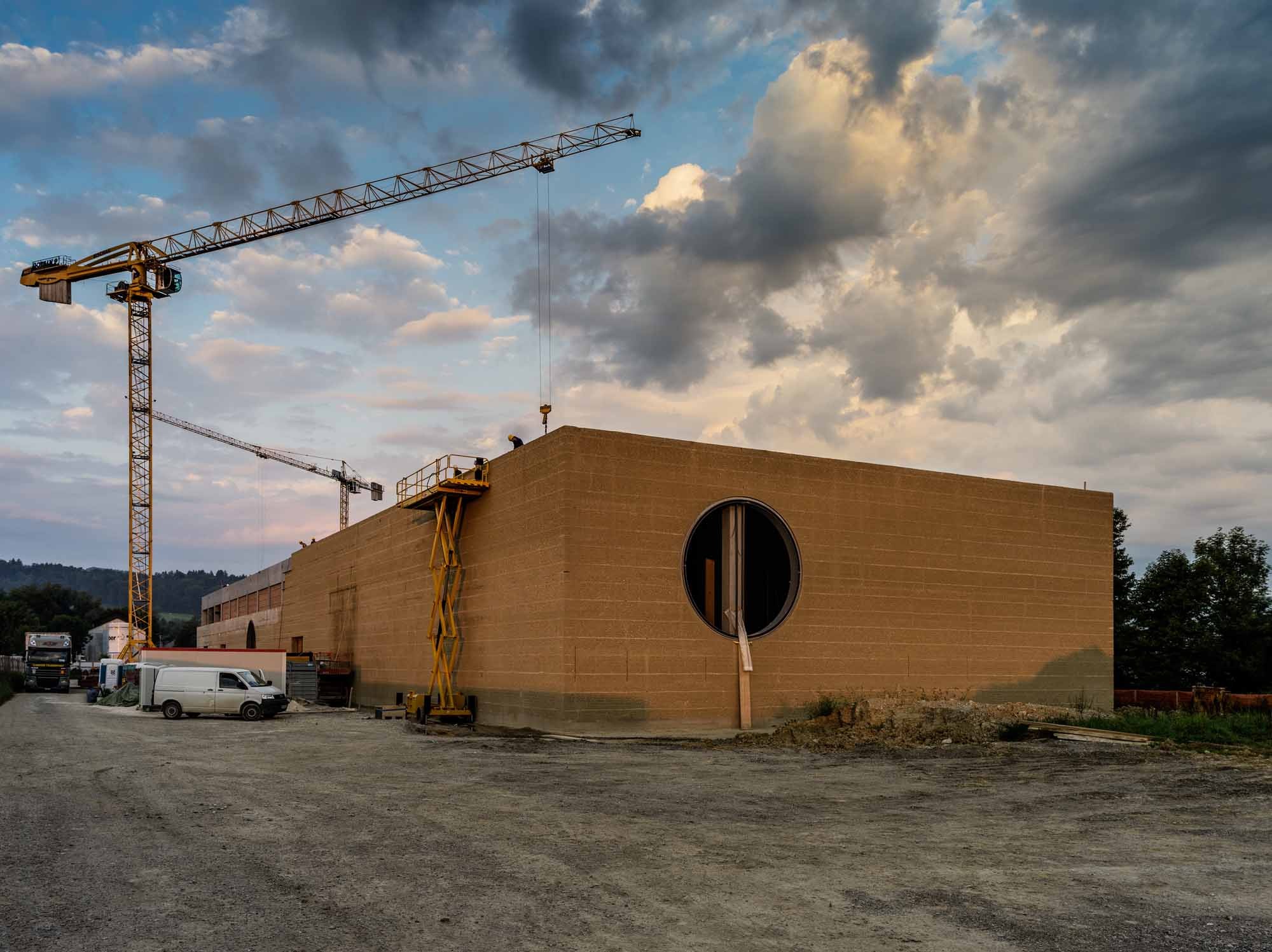 The delivery entrance and warehouse sections of the herb center’s façade are monolithic, with the loam walls visible in the interior as well. The prefabricated earth elements are manufactured in a nearby factory out of ingredients extracted from local quarries and mines. Clay, marl and material excavated on site are mixed and compacted in a formwork and then layered in blocks to build the walls. Thanks to the plasticity of the loam, the seams can be retouched giving the overall structure a homogeneous appearance. To arrest erosion caused by wind and rain, a trass mortar achieved mixing volcanic tuff (trass) with lime, is compacted every 8 layers of earth directly in the formwork. Large round windows illuminate the rooms. The façade is self-supporting and simply linked to the concrete loadbearing structure of the interior.