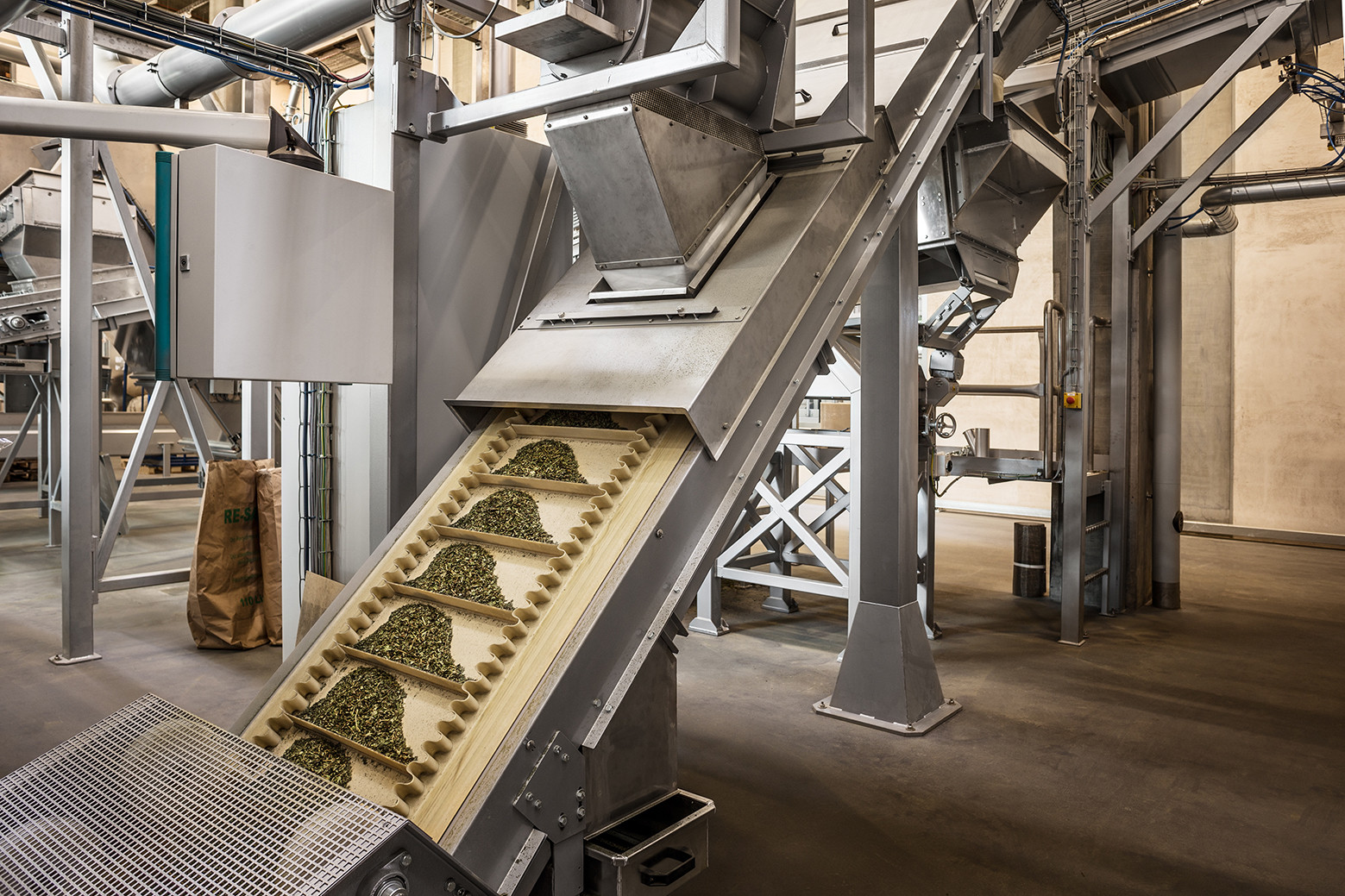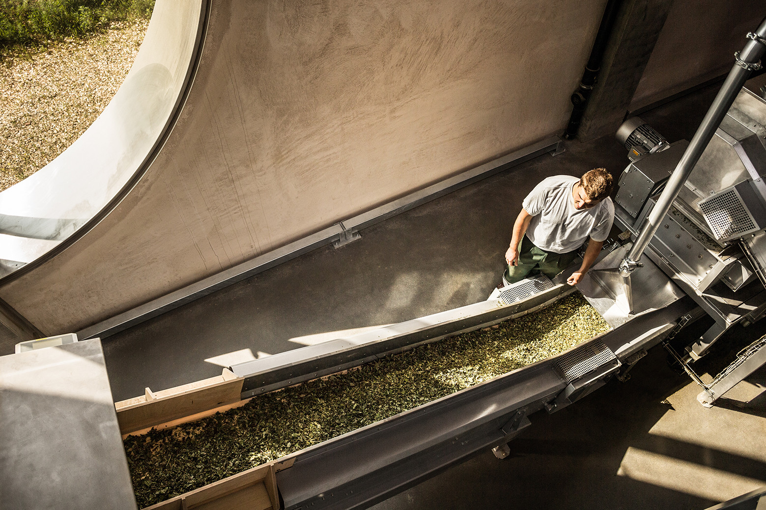 The new Kräuterzentrum (herb center) is situated like an erratic block in the midst of a landscape dotted with conventional industrial buildings. Its elongated shape echoes the pathways and the hedges that have long been a distinctive feature of this area. The length of the building also reflects the steps involved in the industrial processing of herbs, from drying and cutting to blending and storing. The new processing plant enables Ricola to integrate these important steps in the company’s own in-house production.