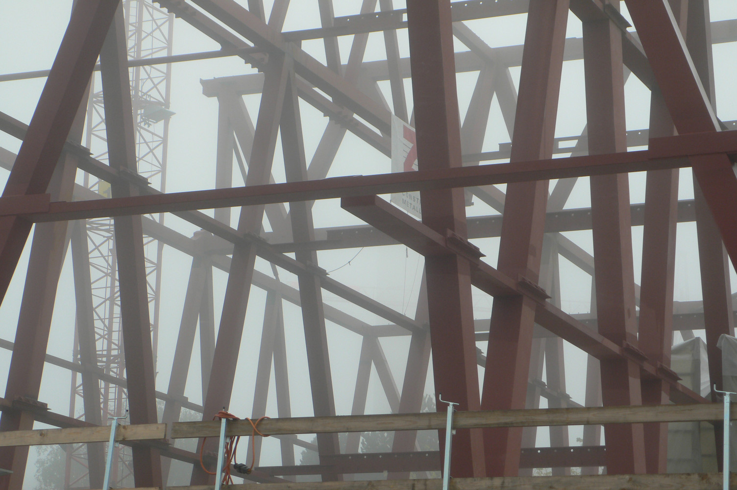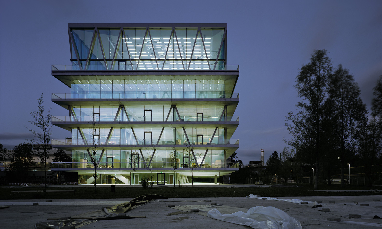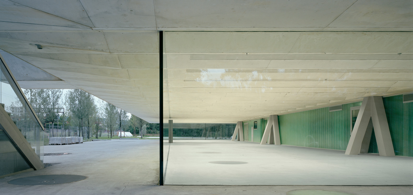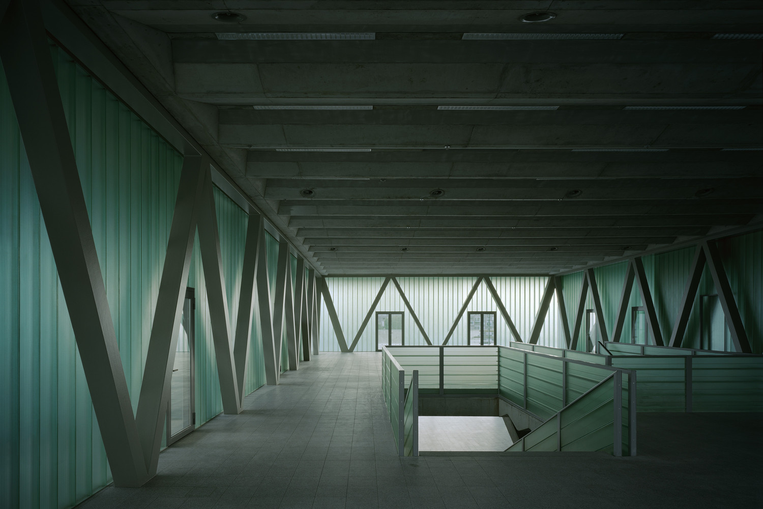 The classrooms are housed in a three-story steel-framed structure; the gymnasium, of approximately the same height, is surrounded by a continuous frame structure resembling that of the classroom block. The result is not merely a gymnasium on top of a school building, but a structure that consists of repeating references on multiple levels. On the ground floor, the building is contracted into a minimal core area.