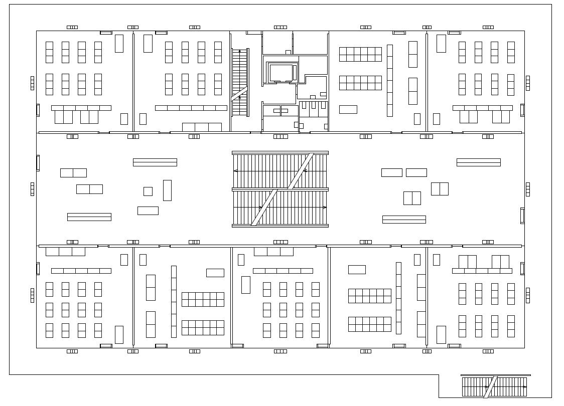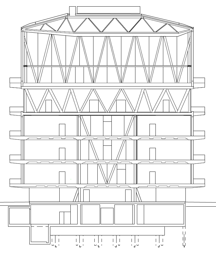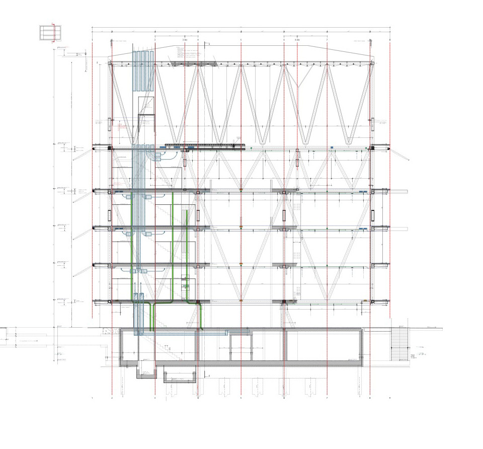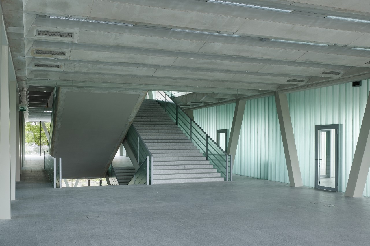 On the fifth floor, the two stairways running in opposite directions meet at a large foyer which provides access to all the public areas, such as the auditorium and library. The gymnasium, the largest and highest space, crowns the whole building.