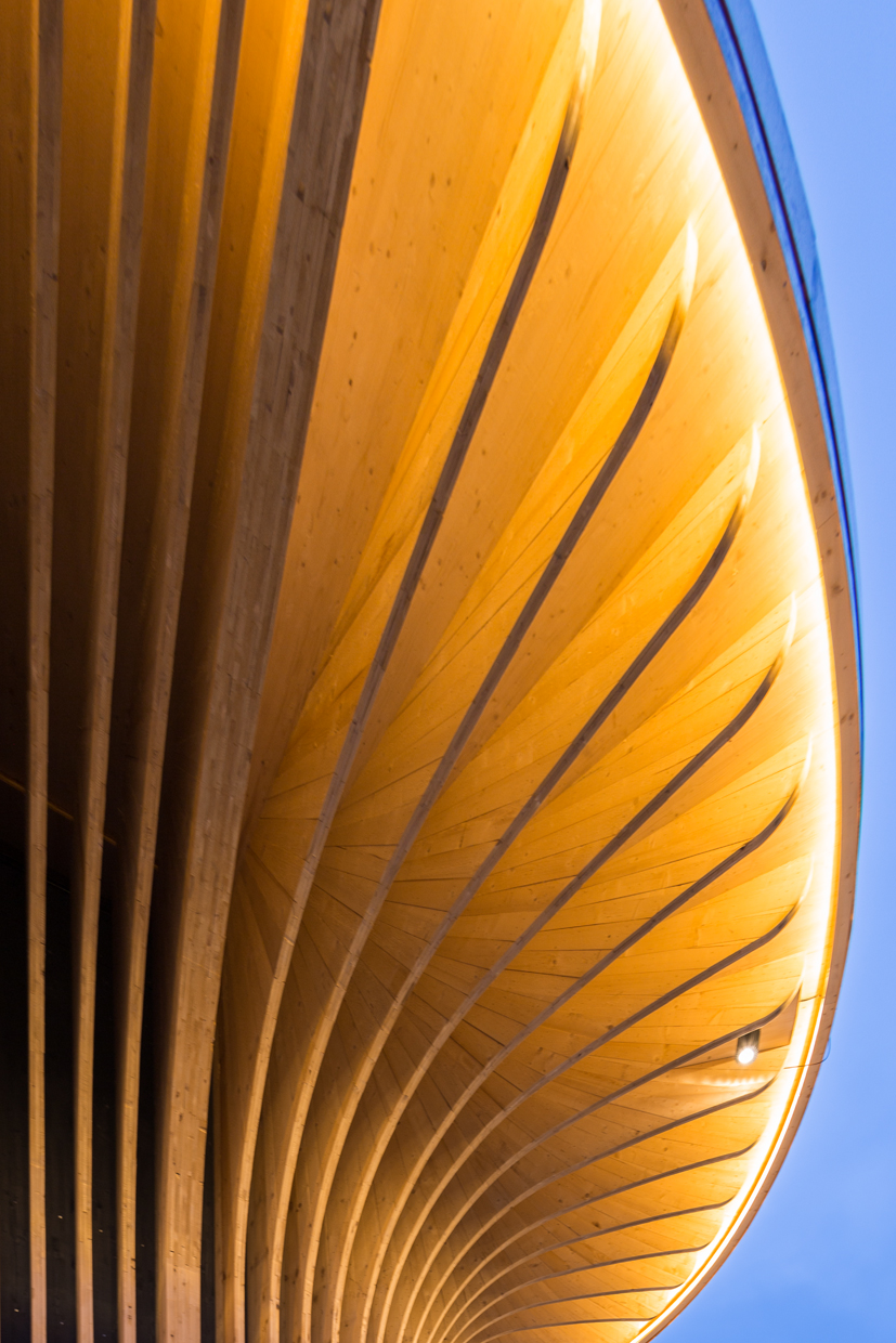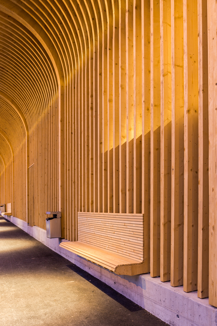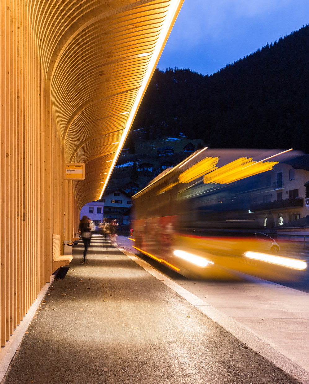 The appearance is long and sleek, the cantilivered roof is imposing. Timber slats are aligned in regular intervals to give the new bus terminal its concise form. Six Postalbus stops are located under the roof, while inside Migros offers its products for sale. A very unusual hybrid for a small village such as Churwalden. Nevertheless a promising collaboration, the grocery chain supplements the public transportation provider perfectly.